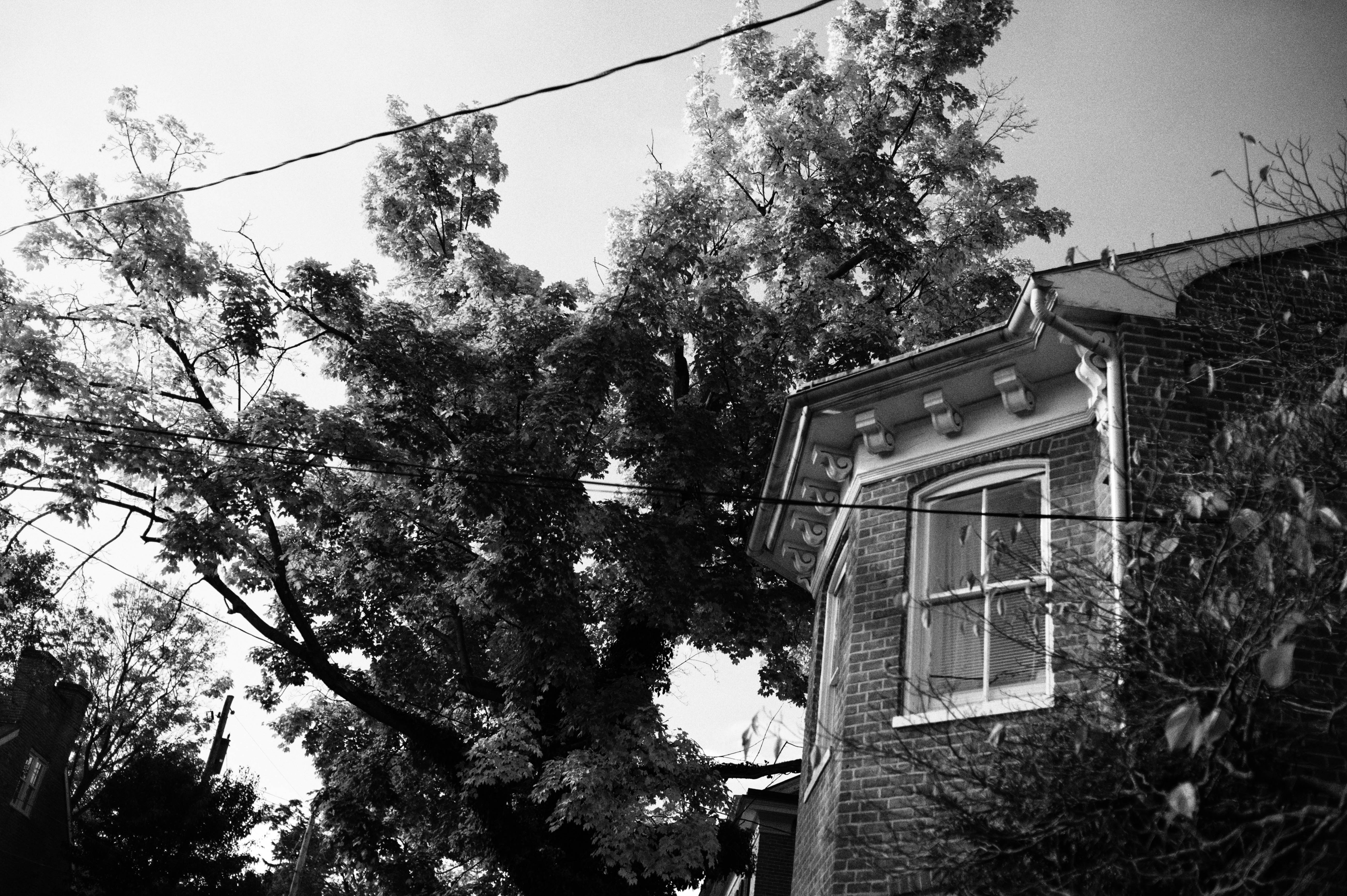 A sunlit corner of an old brick house stands resilient beneath the sprawling branches of a towering tree. The image is captured in black and white, creating a nostalgic mood that evokes memories of simpler times. Delicate shadows and light interplay dance across the surface, hinting at the passage of time within this serene urban landscape.