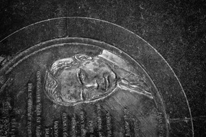 This photograph features a close-up of a weathered bronze plaque, depicting a somber portrait of a man's face. The monochromatic tones amplify the mood of reflection and solemnity, while the polished surface of the plaque contrasts with the surrounding textured stone, drawing the viewer's attention inward. The soft lighting subtly highlights the contours of the face, enhancing the sense of respect and remembrance.