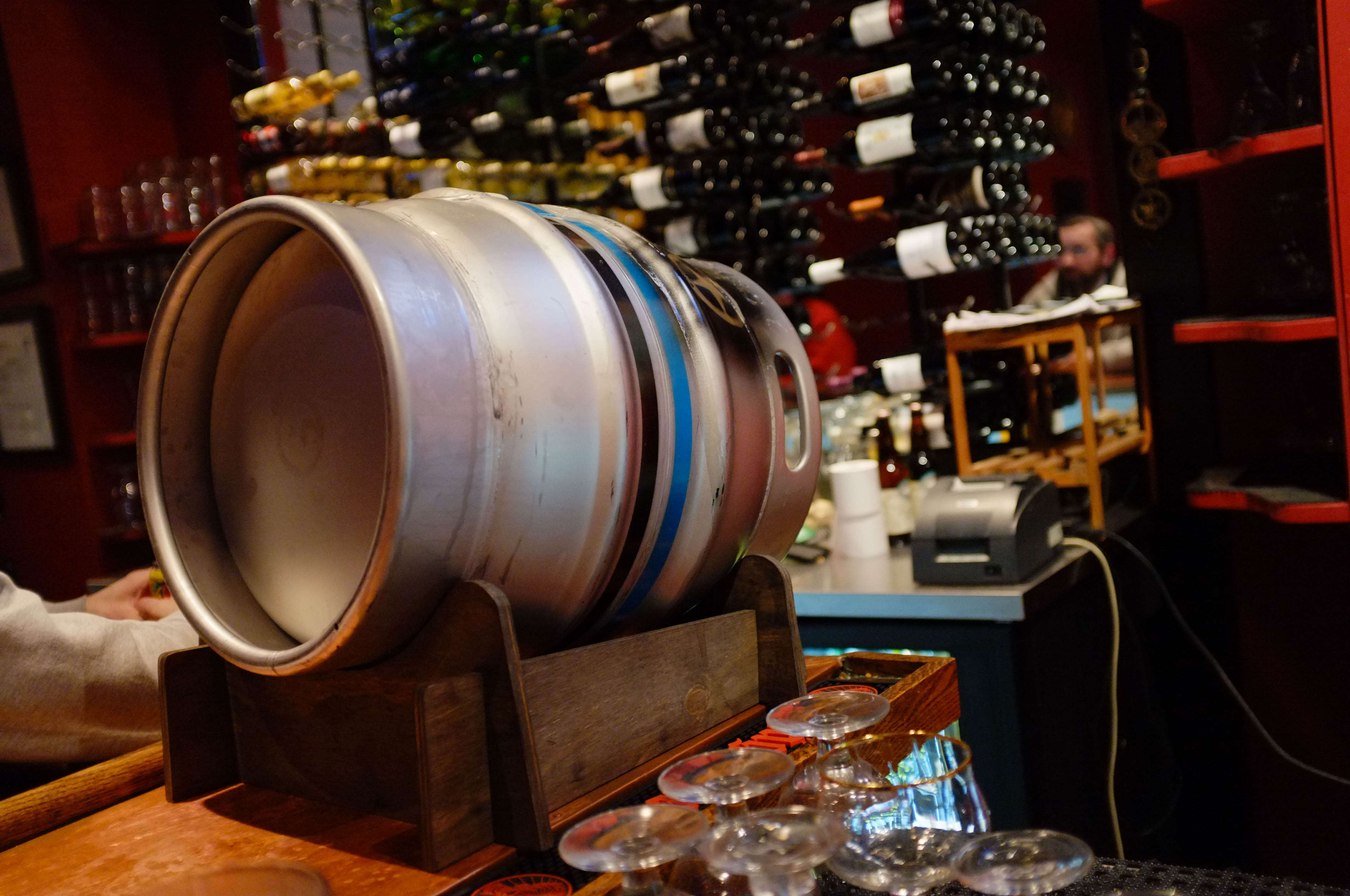This intimate bar scene captures a metallic keg prominently positioned at the forefront, drawing the eye with its polished surface and vibrant blue stripes. The warm, inviting tones of the surrounding décor create a cozy atmosphere, while soft lighting accentuates the textures and adds depth to the composition. In the background, blurred figures and wine bottles suggest a bustling nightlife, contrasting with the stillness of the foreground.
