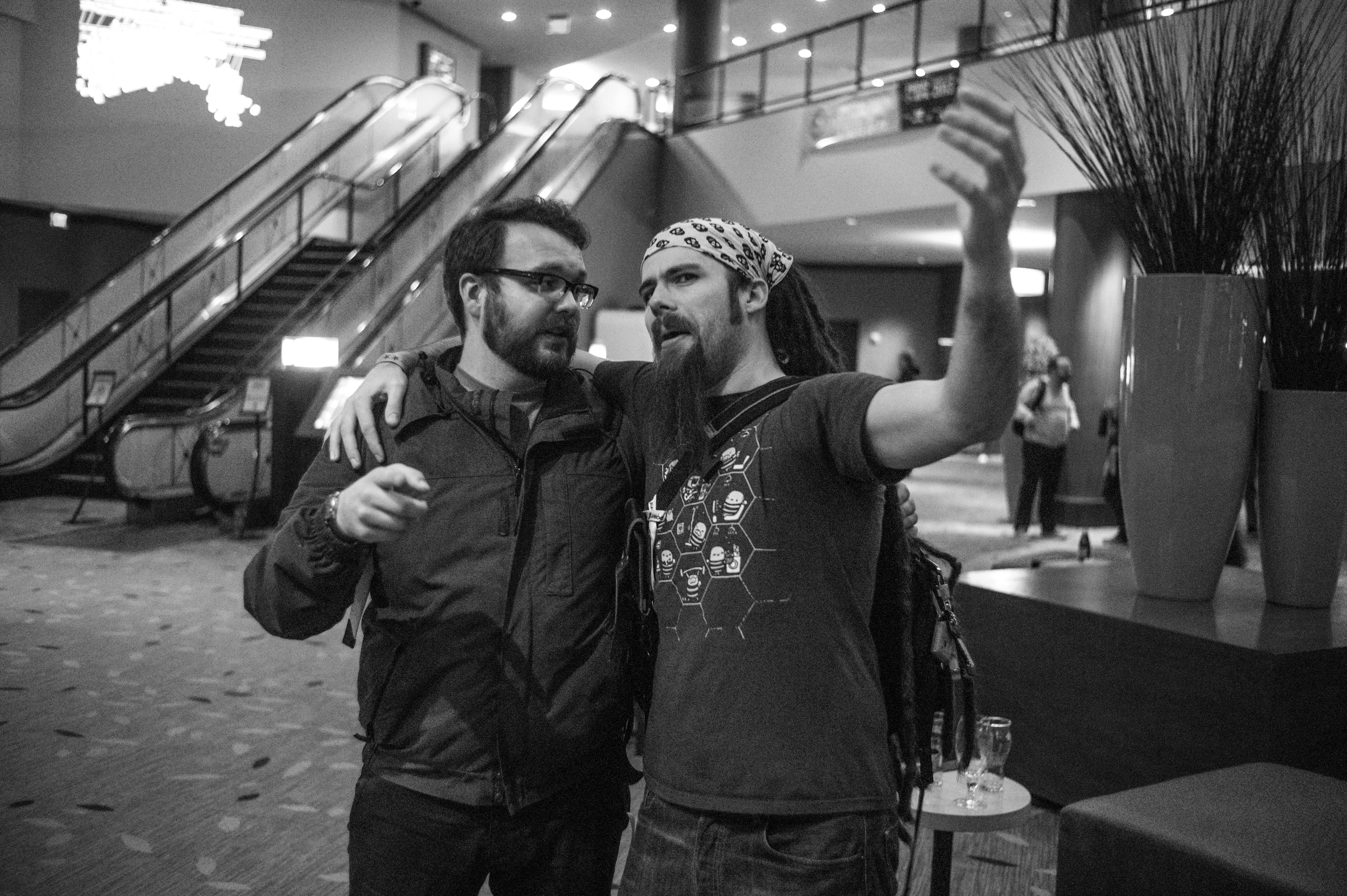In a bustling lobby, two friends share an animated conversation, embodying camaraderie and joy. The soft, ambient lighting contrasts with their expressive gestures, creating an intimate yet lively atmosphere. The blurred background hints at a larger gathering, enhancing the sense of connection amidst the excitement.