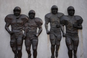 A striking relief sculpture features four football players, their muscular forms captured in mid-stride. The solid bronze texture exudes strength and determination, with subtle shadows enhancing the three-dimensional quality against a pale backdrop. This composition evokes a sense of camaraderie and the relentless spirit of the game.