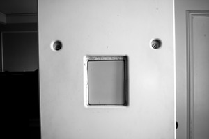 The photograph presents a close-up of a minimalist door, where the stark white surface is interrupted by two peculiar features: a small screw and a square cutout. The monochrome tones emphasize the starkness and create an unsettling mood, suggesting a sense of anonymity or isolation. Soft, diffused lighting further enhances the abstract quality, inviting contemplation of the mundane turned mysterious.