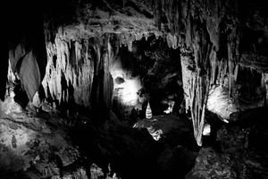 This photograph captures the haunting beauty of a cavernous space, illuminated primarily by soft, ambient lighting that highlights the jagged stalactites and stalagmites. The interplay of light and shadow creates an eerie yet captivating mood, inviting viewers to explore the depths of the subterranean landscape. The monochromatic tones enhance the dramatic textures of the rock formations, emphasizing the surreal, otherworldly quality of this hidden environment.