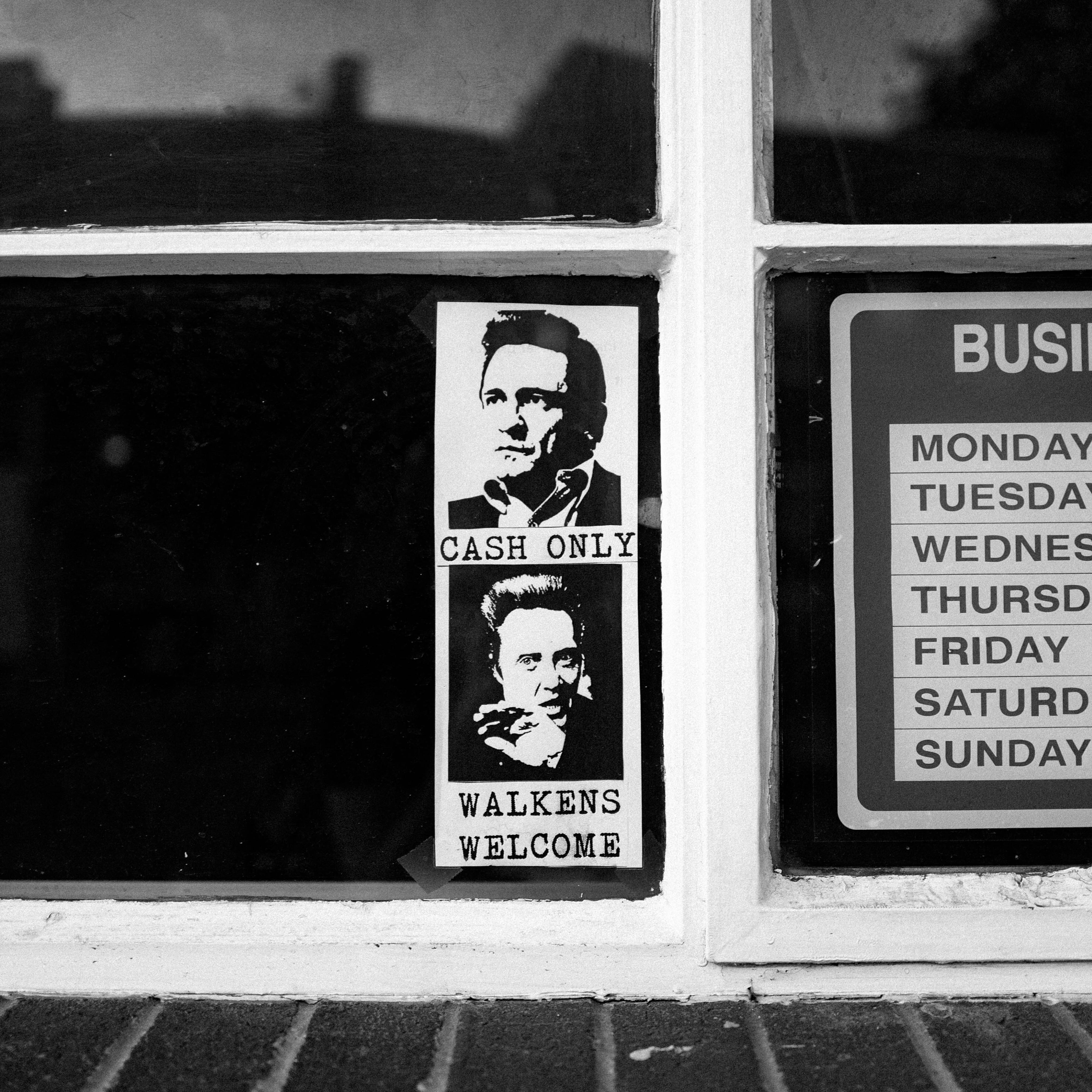 The photograph features a playful sign on a shop window, boldly stating 'CASH ONLY' alongside caricatures of two iconic figures. The monochrome setting enhances the humorous yet nostalgic mood, inviting curiosity and smiles from passersby. The composition draws attention to the contrasts between the stark black-and-white images and the warm, inviting glow of the interior light behind the glass.