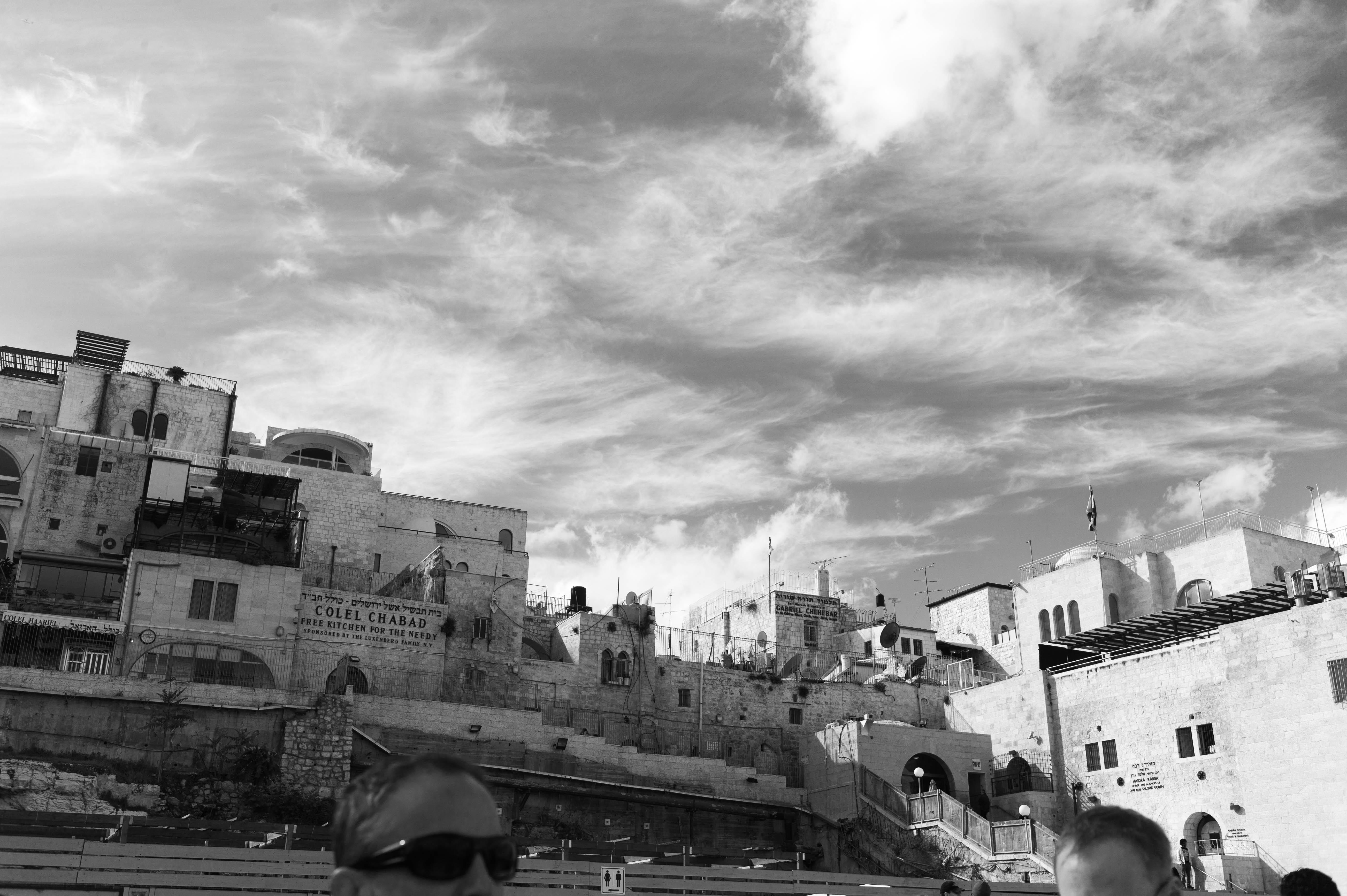This black and white photograph captures a hilly urban landscape, revealing aged stone buildings that echo the weight of history. Wispy clouds stretch across the sky, enhancing the somber yet contemplative mood, while the low angle emphasizes the towering structures. The presence of figures in the foreground introduces a sense of scale and connection to the city's enduring past.