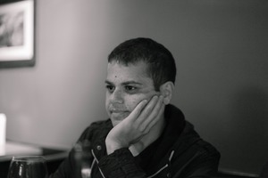 The photograph captures a young man deep in thought, resting his chin on his hand, suggesting a mood of introspection. Soft, muted lighting creates a cozy yet contemplative atmosphere, highlighting his features and the texture of his skin. The blurred background draws focus to his expression, evoking a sense of quiet reflection in a thoughtful moment.