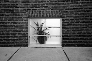 This photograph captures a striking juxtaposition of a solitary plant silhouetted against a frosted window embedded in a rugged brick wall. The stark black-and-white tones amplify the mood of isolation, while the geometric lines of the window frame the organic curves of the plant. Soft diffused light illuminates the plant, creating a sense of mystery and depth in a seemingly mundane urban setting.