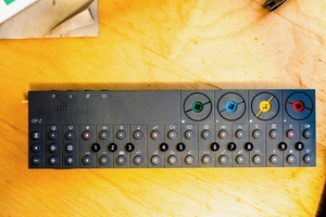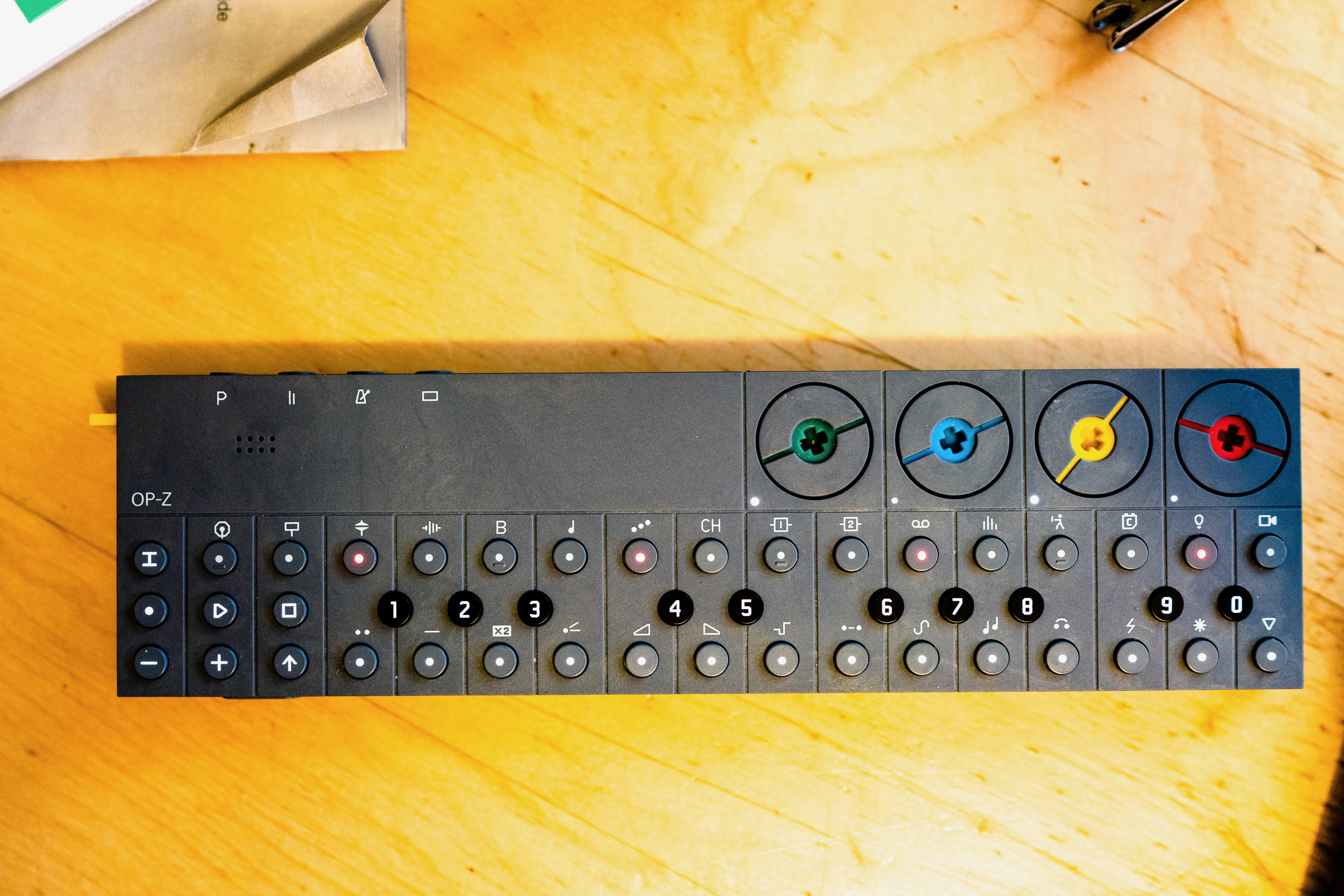 This photograph showcases a sleek music instrument, the OP-Z, resting on a warm wooden surface. The clean lines and muted palette evoke a sense of innovation and creativity, perfectly capturing a moment of inspiration in a minimalist setting. Soft, natural lighting enhances the device's features, inviting exploration and interaction.