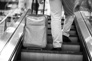 The photograph captures a lone traveler ascending an escalator, suitcase in tow, evoking a sense of movement and transition. The stark black and white tones emphasize the textures of the escalator and the wear of the suitcase, creating a poignant, reflective mood. The composition draws the viewer's eye upward, suggesting a journey toward new horizons amidst the bustling backdrop of a busy environment.
