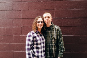 In this warm and inviting photograph, two individuals stand closely together against a rich, textured maroon wall. Their matching plaid shirts add a playful touch to the composition, while their relaxed smiles exude a sense of camaraderie and comfort, enhanced by soft, natural lighting.