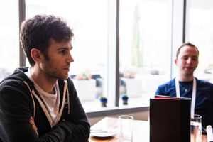 In a softly lit café setting, a young man sits in profile, deep in thought, his brow slightly furrowed, suggesting a moment of introspection. The composition features a blurred figure in the background, enhancing the sense of intimacy and dialogue within the scene. Natural light spills through large windows, casting a warm glow that adds to the reflective mood of the moment.