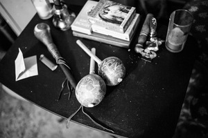 A moody black-and-white composition captures a cluttered table, brimming with musical instruments and personal artifacts. The lighting softly illuminates two intricately designed maracas, hinting at stories waiting to be told. A sense of nostalgia pervades the scene, inviting viewers to ponder the past and the melodies that once filled the air.