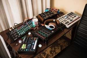 This intimate photograph captures a creative workspace filled with an array of electronic music equipment, each device alive with colored lights. The warm glow of the ambient lighting combined with a nearby window casts a serene mood over the scene, inviting a sense of focus and inspiration. A bottle of water and headphones suggest a moment of deep concentration, as if the artist is on the brink of crafting a new sound masterpiece.