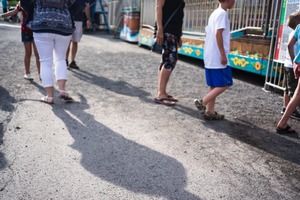 A bustling scene captures the fleeting moments of a vibrant fairground. The soft, golden light casts elongated shadows on the ground, adding depth to the composition, while people in casual summer attire meander along the path, evoking a sense of joy and nostalgia. Colorful attractions peek subtly in the background, hinting at the excitement just beyond the frame.