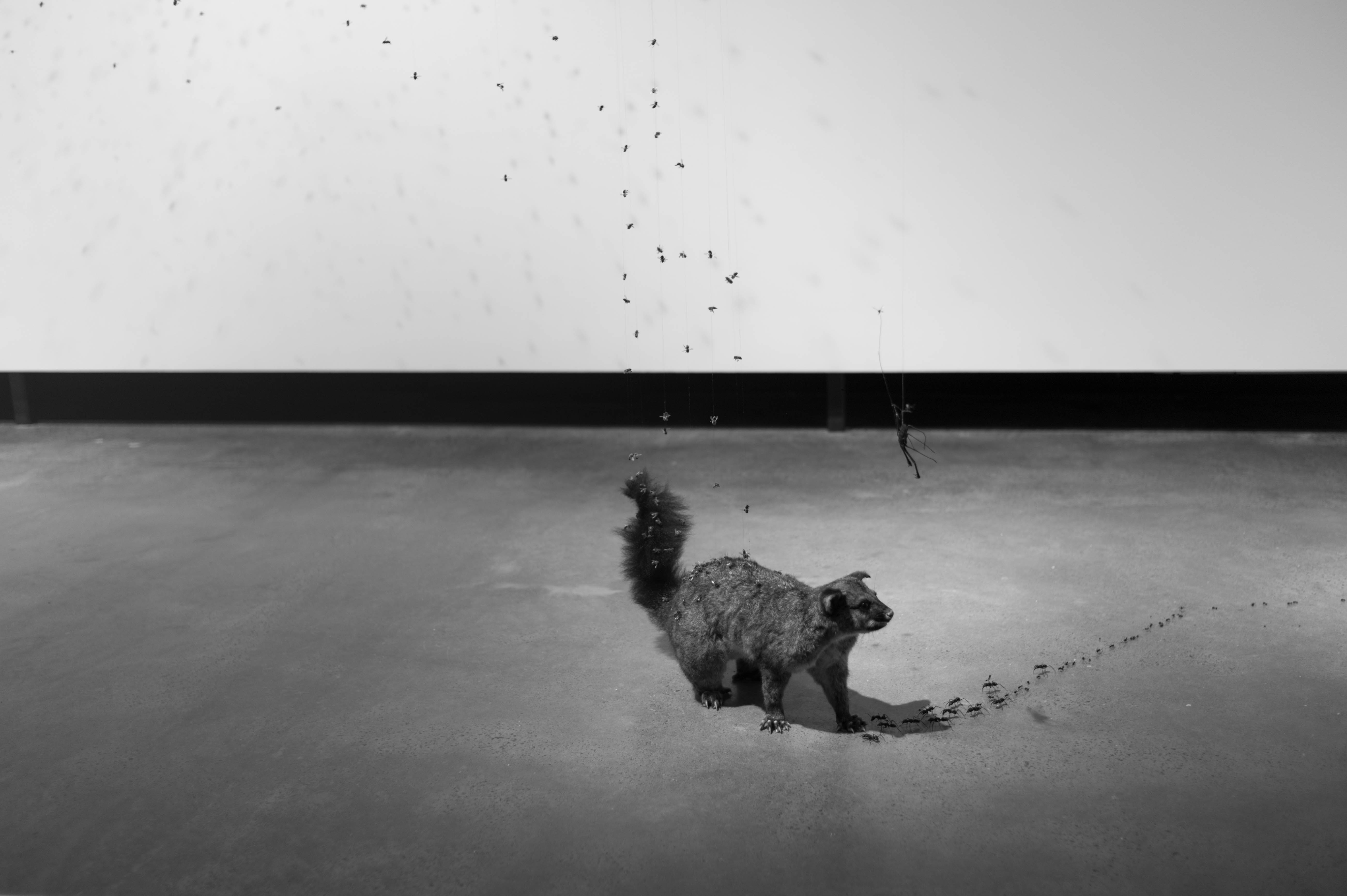 In this stark black-and-white photograph, a solitary cat gazes intently at shadows cast upon a minimalist backdrop. The scattered figures above create an ethereal mood, enhancing the sense of curiosity and isolation. The subtle play of light and shadow adds depth, transforming the scene into a contemplative exploration of space and presence.
