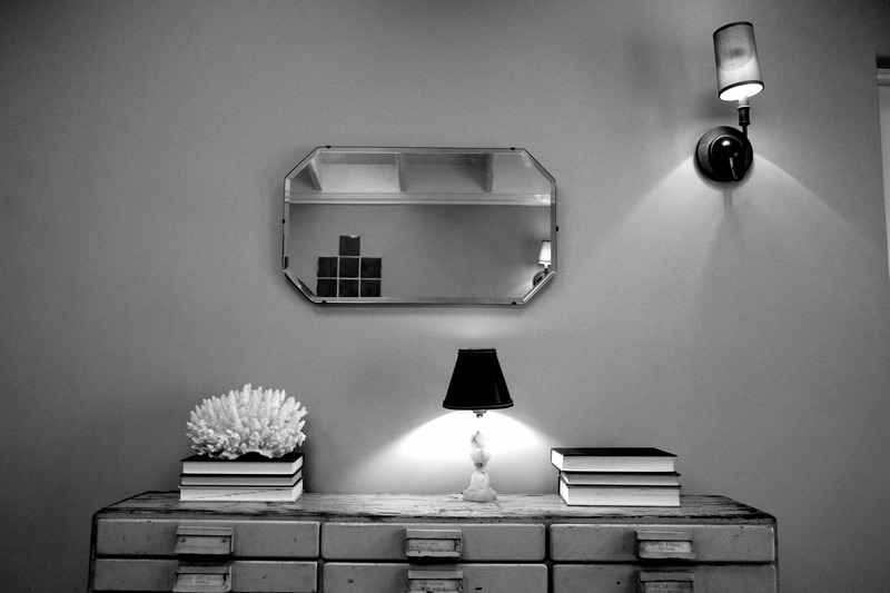 A minimalist scene features a wooden console table adorned with stacked books, a coral centerpiece, and a softly glowing table lamp. The black-and-white composition emphasizes the interplay of light and shadow, creating a tranquil and inviting atmosphere. A mirror reflects the subtle details of the room, enhancing the sense of depth and calmness.