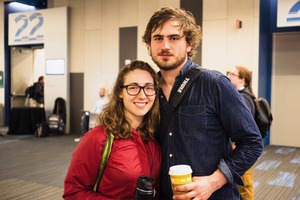 The photograph features a joyful couple standing close together, exuding warmth and affection against a backdrop of a bustling venue. Soft lighting enhances their smiles, inviting a sense of intimacy and connection amidst the activity around them. Their casual attire contrasts with the formal setting, adding an authentic, down-to-earth vibe to the scene.
