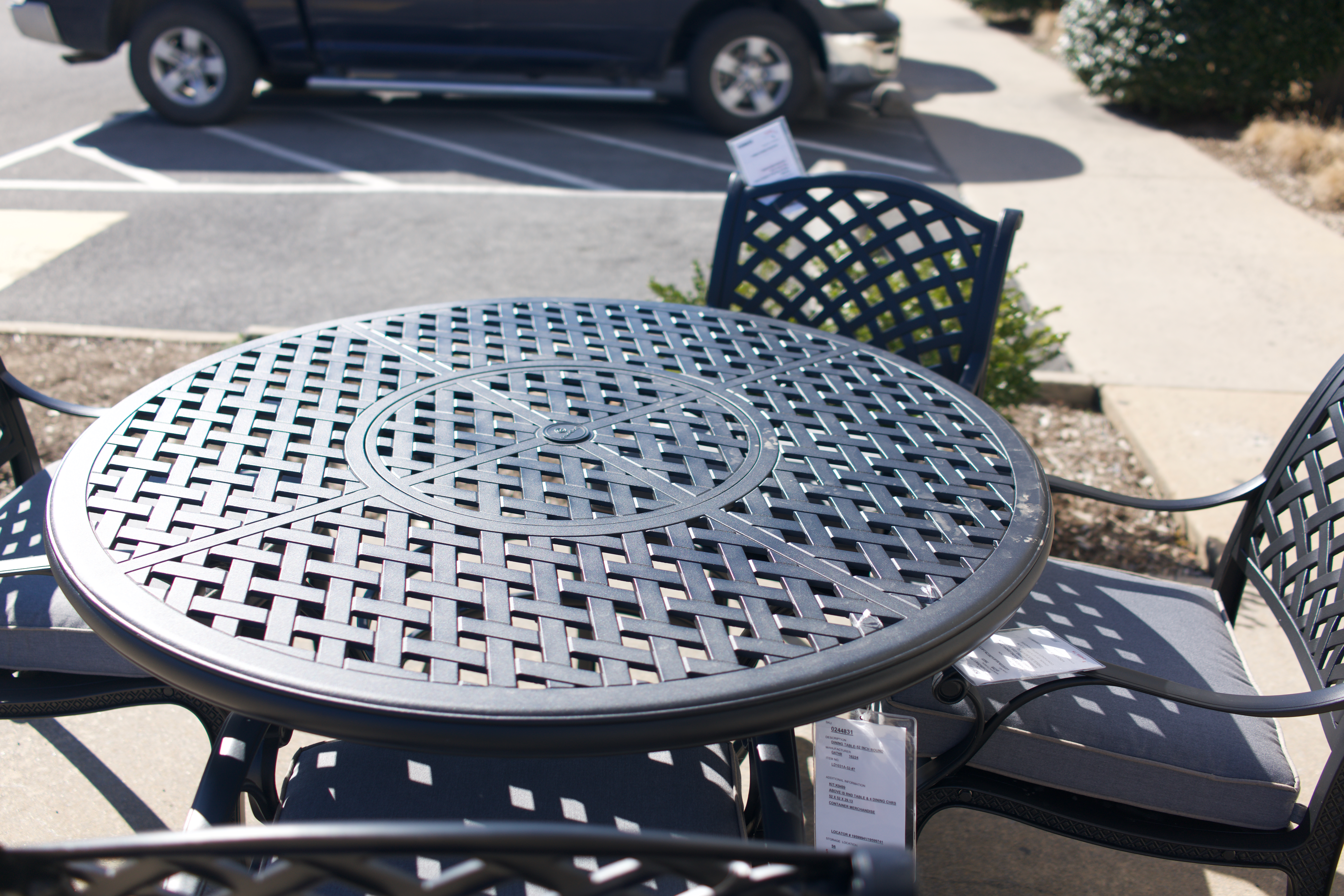 The photograph captures a round, intricately designed metal patio table, poised for gatherings under a sunny sky. Soft shadows dance across its surface, enhancing the textured pattern of the latticework. The calm, inviting atmosphere hints at leisurely afternoons spent with friends or family in an outdoor setting.