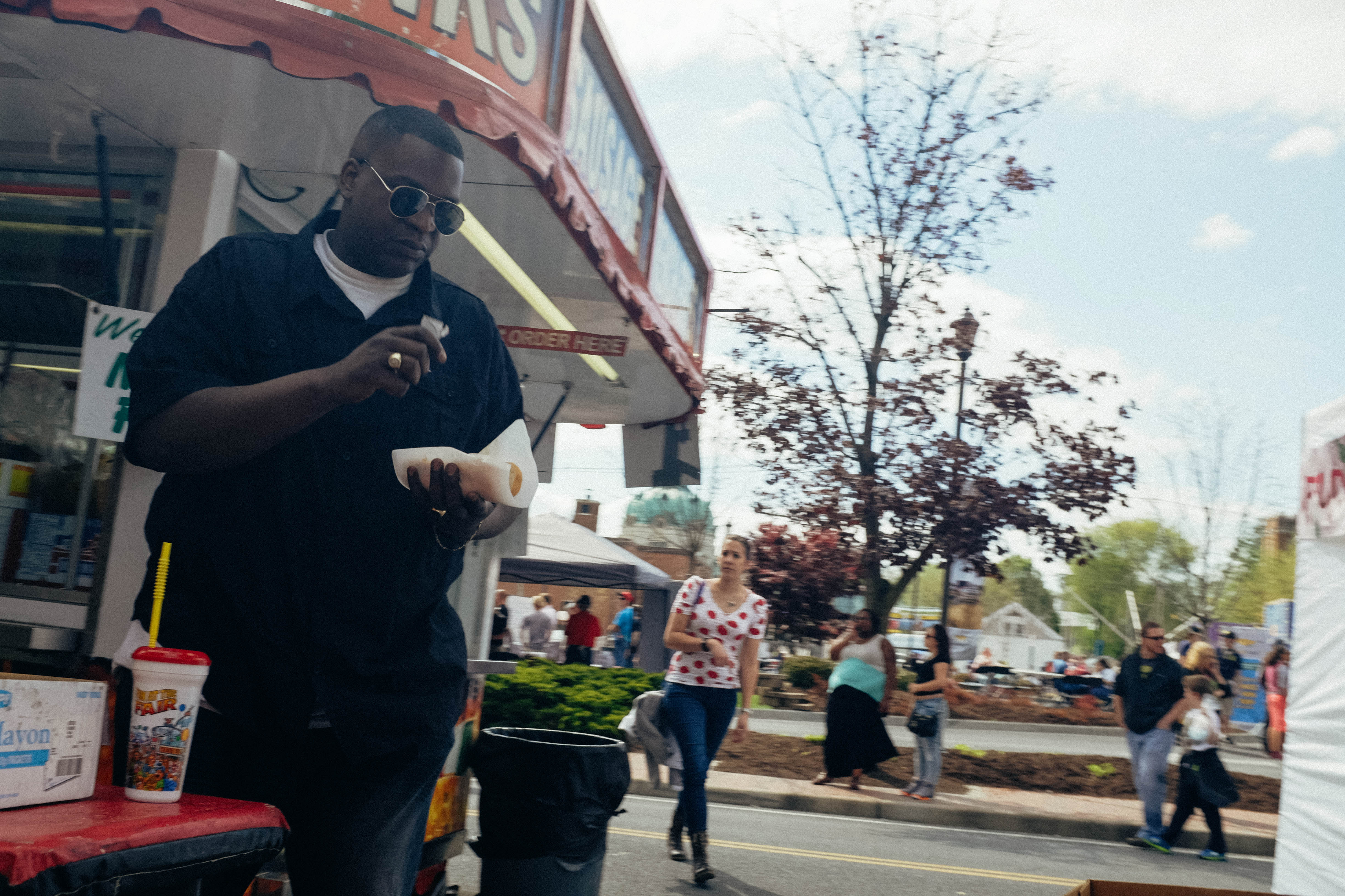 In this vibrant street scene, a man in dark sunglasses prepares food at a colorful food stand, exuding a sense of focus amidst the lively, bustling atmosphere. The composition captures both the vendor’s calm demeanor and the energy around him, with pedestrians strolling in the background under a bright, partly cloudy sky. The interplay of natural light and shadows enhances the casual, inviting mood of the outdoor event.