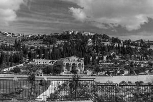 This monochromatic photograph captures a serene hillside dotted with lush, towering cypress trees and historic architecture nestled in the landscape. The composition draws the eye upwards, revealing a captivating contrast between the rugged terrain and the elegant structures above. Ambient light filters through soft clouds, enhancing the tranquil mood and giving the scene a timeless quality.