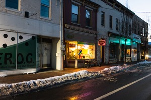 This photograph captures a cozy street scene during twilight, showcasing a café with warm, inviting lights against the backdrop of a chilly winter evening. The composition highlights the interplay between the illuminated storefront and the snow-covered pavement, creating a comforting yet serene mood. The contrast between the soft light indoors and the darkening exterior emphasizes a sense of warmth amid the cold.
