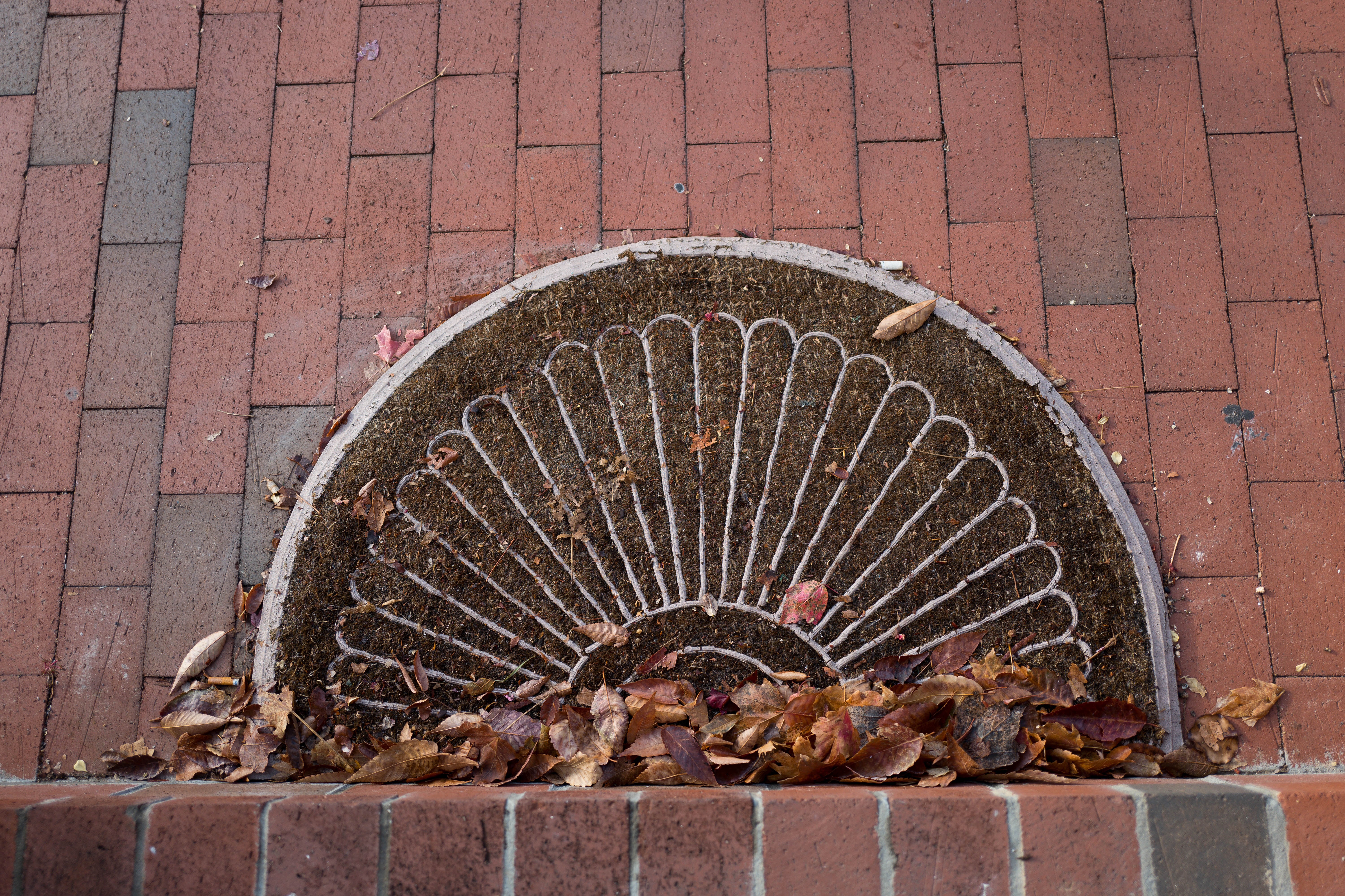A decorative mat with a fan-like design partially obscured by a layer of fallen leaves sits atop a brick pathway. The muted colors and soft light create a melancholic yet inviting atmosphere, hinting at the changing season. The composition draws the eye to the intricate pattern of the mat, contrasting with the earthy tones of the leaves and bricks.
