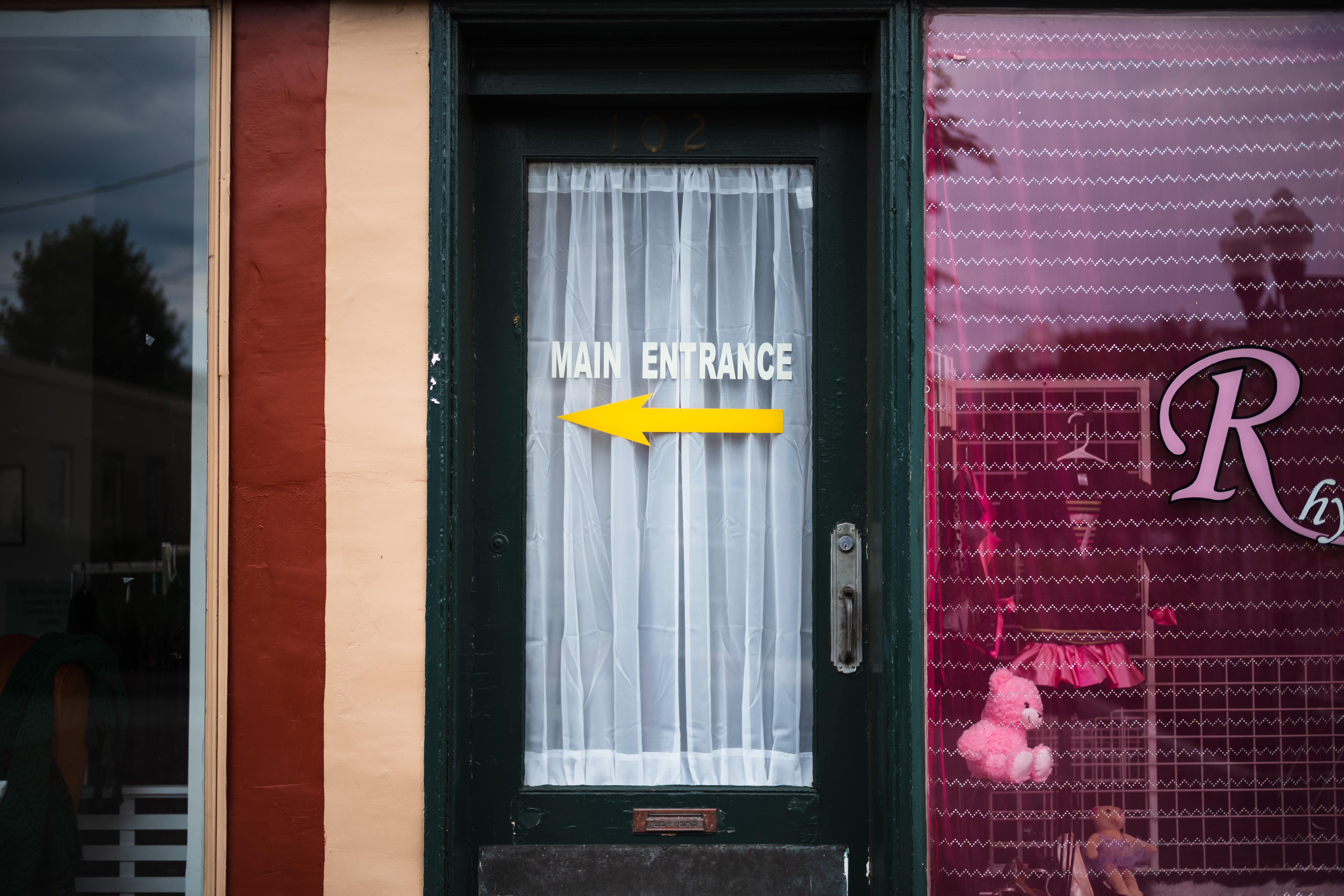This photograph captures a quaint storefront entrance adorned with a modest curtain and an inviting sign indicating 'MAIN ENTRANCE.' The composition showcases a harmonious blend of deep greens and warm earthy tones, while the playful yellow arrow directs the viewer’s attention effortlessly. A soft, diffused light enhances the nostalgic mood, contrasting subtly with the vibrant pink hues visible through the adjacent window.