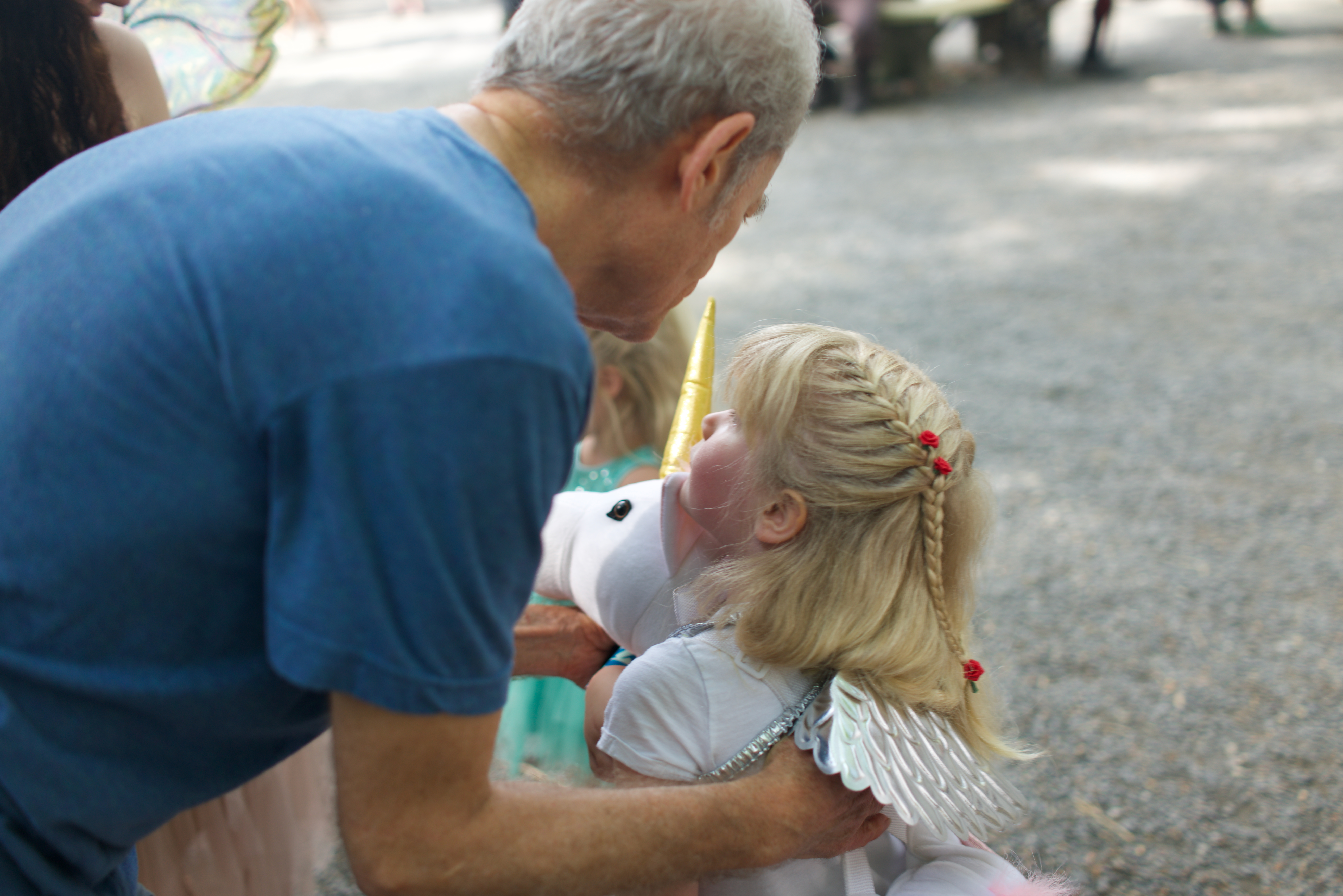 A heartwarming interaction unfolds between a man and a young girl dressed as a unicorn. The soft, diffused lighting creates a dreamy atmosphere, enhancing the whimsical mood of the scene. The close composition highlights their intimate connection, evoking a sense of joy and wonder in a playful setting.