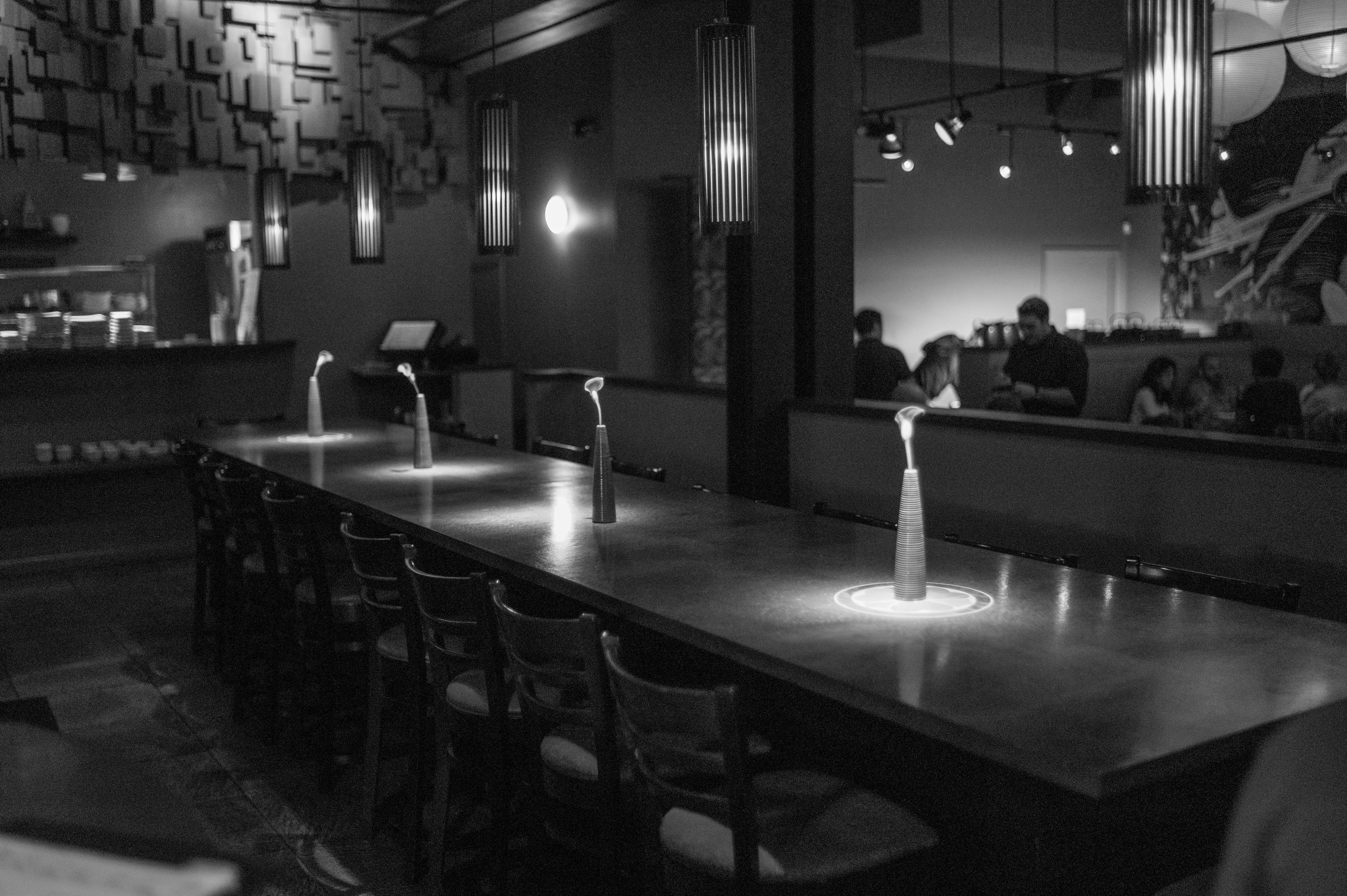 The photograph captures a long, minimalist dining table illuminated by soft, centered lights, creating an intimate atmosphere. The monochrome tones enhance a mood of sophistication and calm, while the geometric wall decor adds an artistic flair. With diners in the background engaging in conversation, the scene feels both lively and serene, inviting patrons to enjoy a shared culinary experience.
