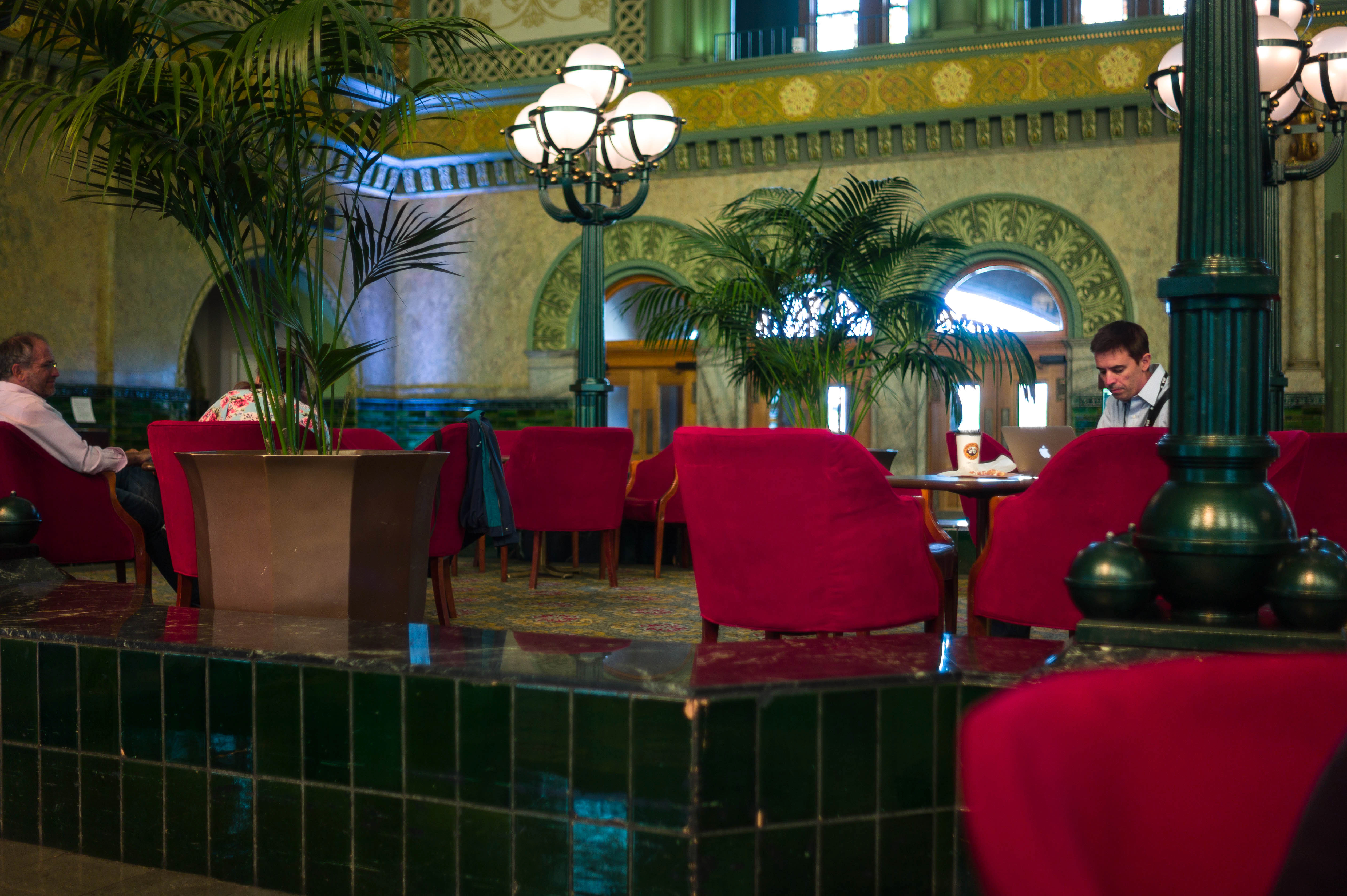 The photograph captures a serene café scene, featuring plush red chairs arranged around a lush green potted plant. Soft lighting and intricate architectural details create a warm, inviting atmosphere, while a lone figure focuses intently on their work, adding a sense of quiet contemplation. The composition emphasizes both comfort and solitude, inviting viewers to imagine the stories unfolding within this elegant space.