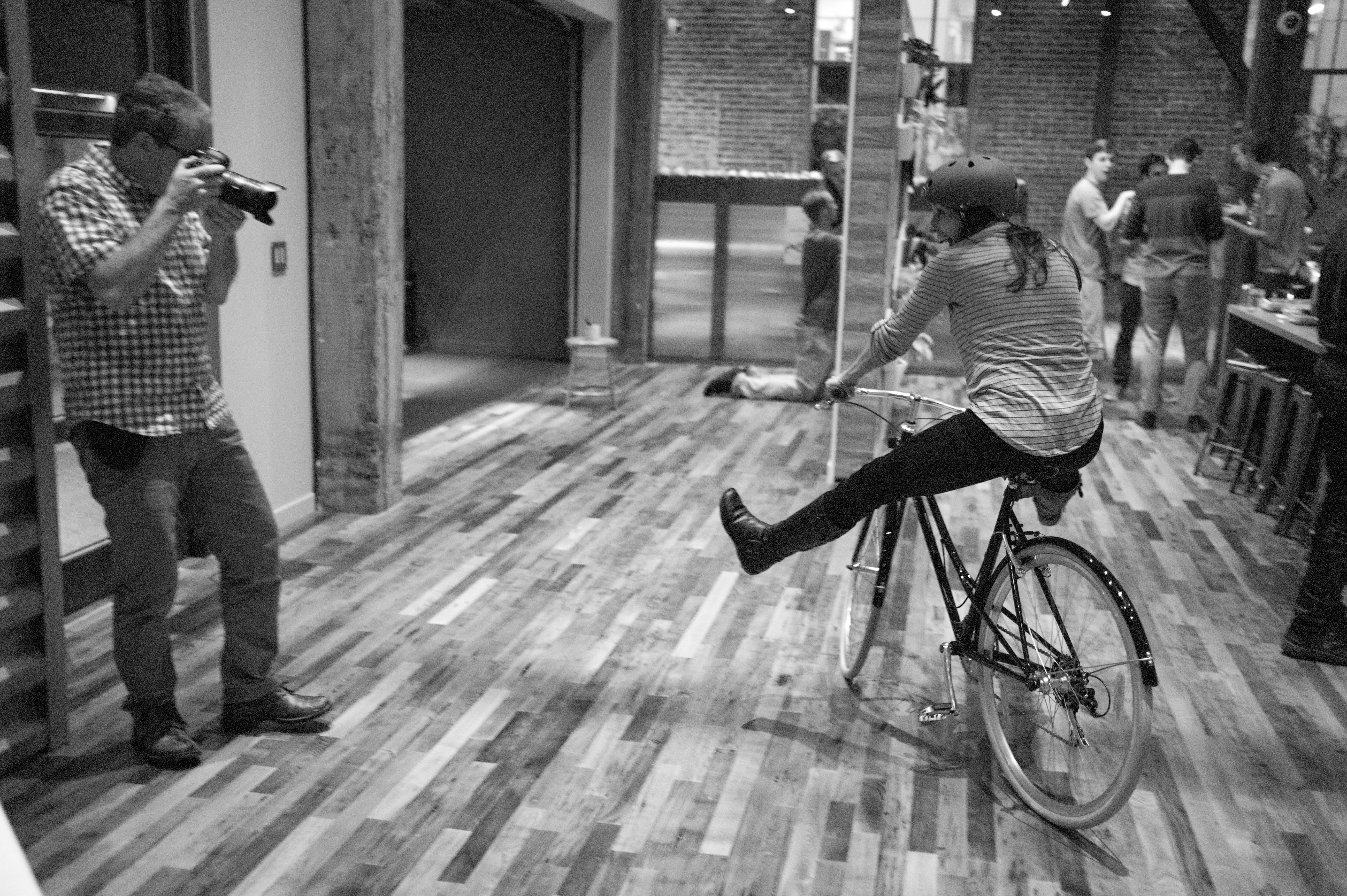 In this lively black-and-white scene, a woman playfully rides a bike with one leg extended, embodying a sense of freedom and joy. The warm wooden floors and industrial backdrop create a juxtaposition of casual fun and modern design, while the ambient lighting adds a cozy, inviting warmth to the atmosphere. A man captures the moment with his camera, emphasizing the spontaneous spirit of the gathering.