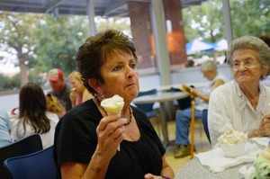 In a cozy ice cream parlor, a woman holds her cone with a contemplative expression, juxtaposed against the soft chatter of a nearby group. The warm, natural light filtering through large windows creates an inviting atmosphere, enhancing the nostalgic feel of sharing simple pleasures. To her right, an elderly woman observes quietly, adding a layer of warmth and connection to the scene.