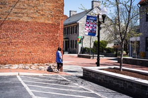 The photograph captures a lone figure walking past textured red brick and grey stone buildings in a quaint town square. Sunlight bathes the scene, creating a bright and inviting atmosphere, while the colorful banner adds a touch of artistic vibrancy. The composition emphasizes the serenity of the moment, with the juxtaposition of historic architecture and a peaceful urban setting.