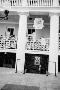 In a black and white scene, a young child stands at the entrance of a Cajun-themed establishment, gazing up at a balcony filled with indistinct figures engaged in conversation. The strong architectural lines and soft ambient lighting create a contrast between the lively gathering above and the solitary figure below, evoking a sense of intrigue and quiet contemplation.
