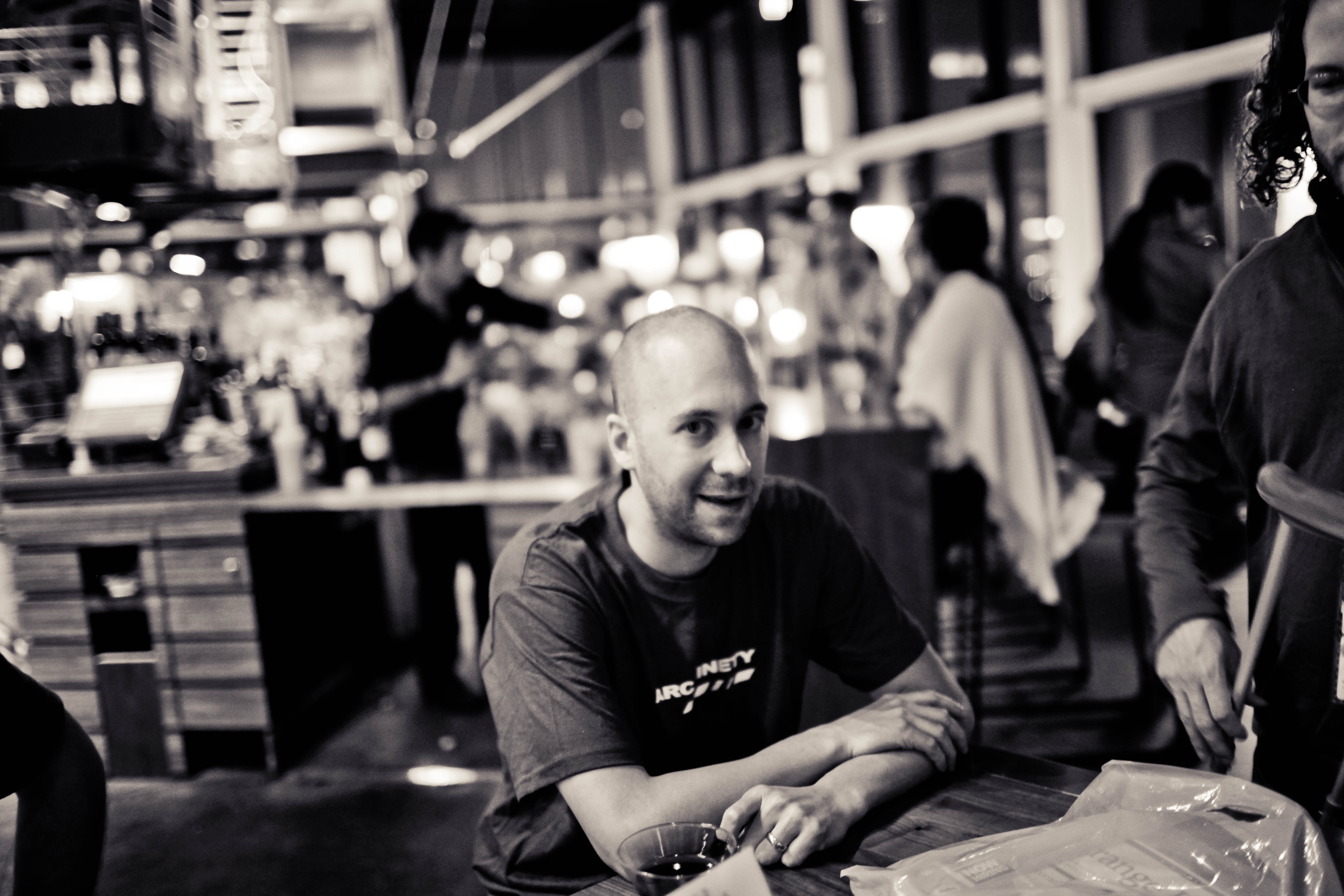 This intimate photograph captures a candid moment in a lively bar, with a focus on a seated man whose subtle smile suggests warmth and engagement. The dim, atmospheric lighting adds a nostalgic quality, accentuating the bustling backdrop of patrons and soft reflections. The composition draws the eye to the subject amidst blurred interactions, evoking a sense of connection in a vibrant social scene.