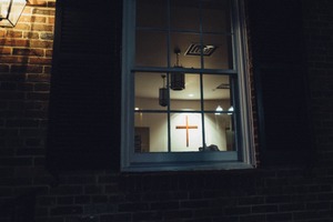 Through a softly illuminated window, a striking orange cross stands against a muted wall, casting a sense of warmth in the evening darkness. The play of light highlights the brick exterior, subtly framing the peaceful scene within. This composition evokes a contemplative mood, inviting viewers to ponder the intersection of faith and solitude.