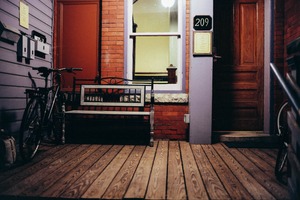 The photograph captures a charming exterior scene of a small porch, presenting a vintage bench and a bicycle, suggesting a sense of community and personal history. Warm, inviting lighting spills from the window, contrasting with the cool tones of the surrounding wall, creating a cozy yet tranquil atmosphere. The composition emphasizes the rustic wooden floorboards, leading the viewer's eye towards the warmly lit entrance, inviting exploration and storytelling.