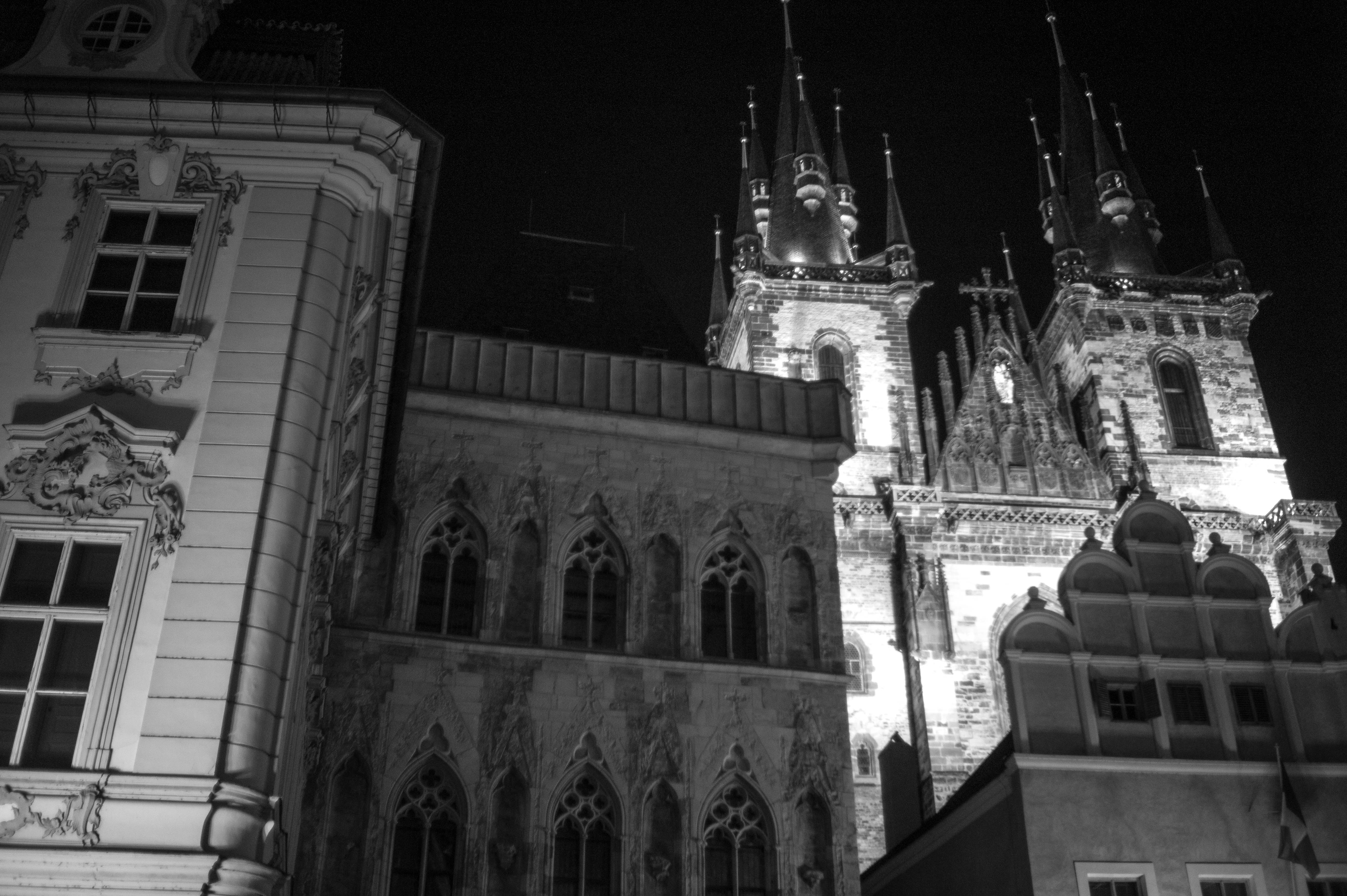 This striking black-and-white photograph captures the ethereal beauty of towering Gothic architecture against a night sky. The dramatic lighting highlights the intricate details of the buildings, casting long shadows and creating a sense of mystery and grandeur. The composition draws the viewer's eye upward, emphasizing the height and elegance of the spires, evoking a mood of enchantment and history.