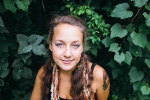In this portrait, a young woman gazes softly into the camera, her calm demeanor contrasting beautifully with the lush, green foliage surrounding her. The natural light highlights her features and tattoos, creating an intimate, serene atmosphere that invites quiet reflection. The composition, with its focus on the subject amidst rich greenery, enhances the sense of connection to nature.
