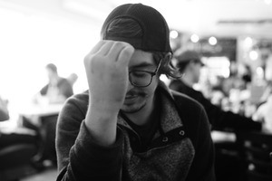 In a softly lit cafe, a young man rests his forehead against his hand, exuding a sense of contemplation or perhaps frustration. The blurred background captures diners engaged in their own activities, adding depth to the scene while maintaining the focus on his introspective state. The monochromatic tones enhance the mood, emphasizing the emotional weight of the moment.