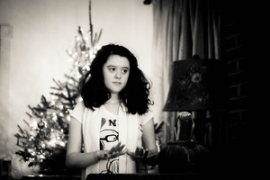 In a dimly lit room, a young woman stands pensively, her hands gently poised as if lost in thought. The soft glow of a nearby Christmas tree casts a warm ambiance, contrasting with the monochromatic tones of the image. The atmosphere is intimate and reflective, inviting viewers to connect with her quiet moment of contemplation.