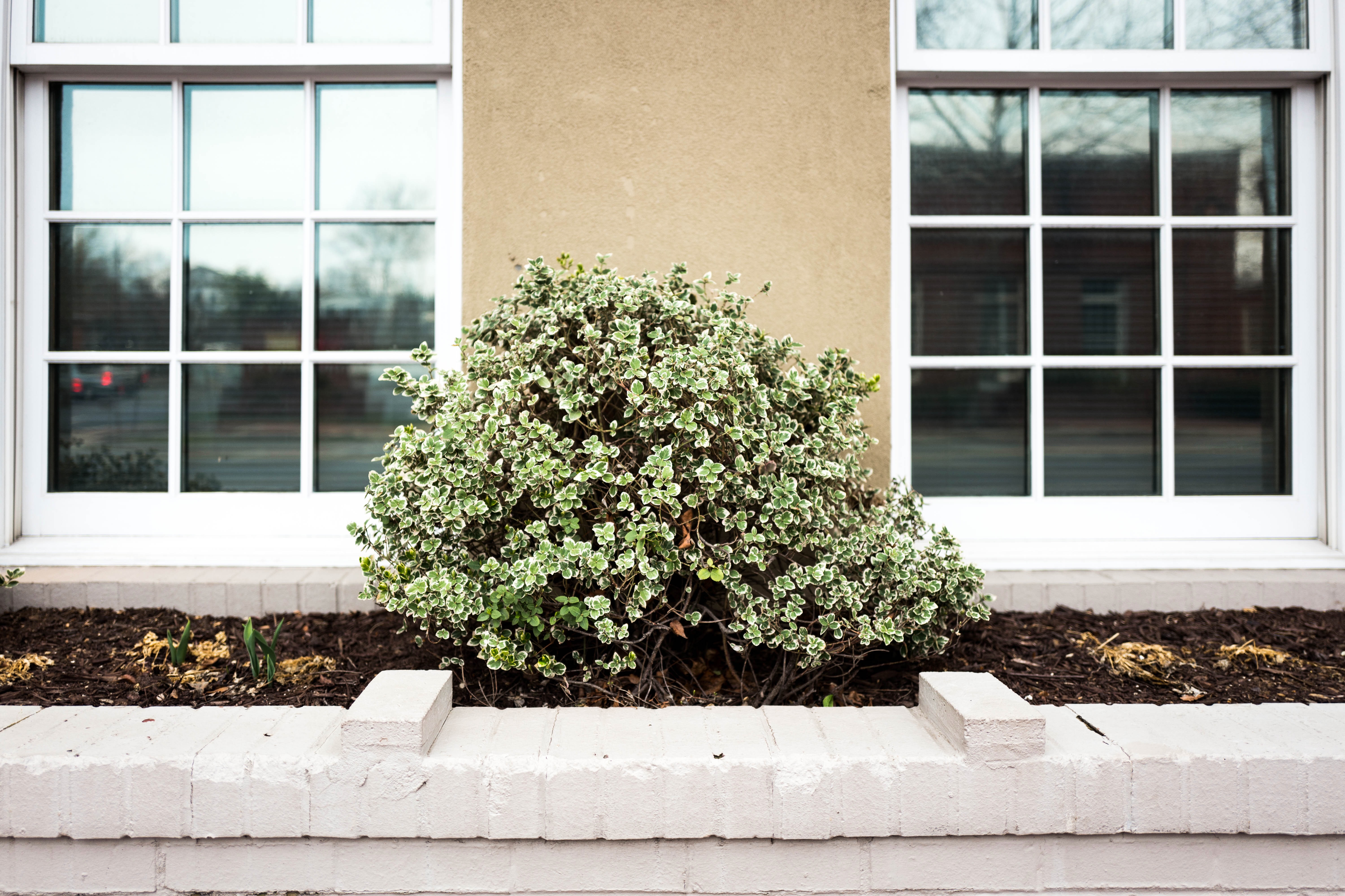 The photo captures a neatly trimmed bush positioned between two large windows, evoking a sense of calm and order. The muted tones of the wall create a warm backdrop, while the bush’s vibrant green leaves provide a refreshing contrast against the subdued environment. Soft, natural light bathes the scene, enhancing the tranquility and inviting contemplation of the simple beauty of everyday life.