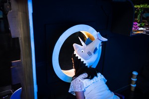 In this whimsical photograph, a child wearing a playful shark hat leans curiously through a circular opening, illuminated with a warm glow. The contrast of the cool blue background adds a sense of wonder and innocence, reflecting a playful mood as the child explores and engages with their surroundings. The composition draws the viewer's eye towards the child's interaction, highlighting the joy of discovery in a vibrant, imaginative space.