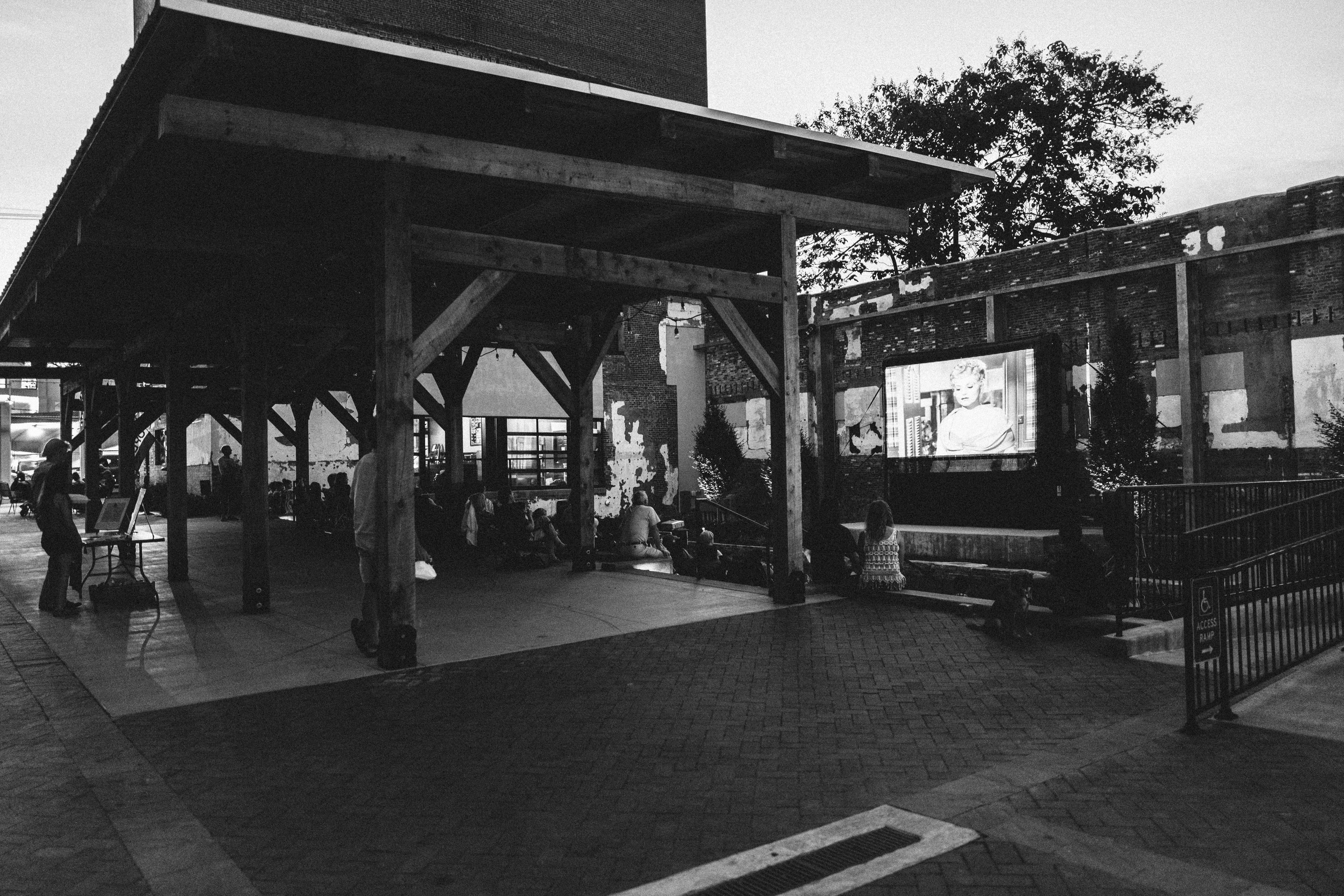 The photograph captures a cozy outdoor movie night scene under a large wooden structure, where a diverse group of people is seated on the ground, focused on a large screen displaying a classic film. The soft, ambient lighting enhances the intimate atmosphere, highlighting the rustic details of the architecture and the warmth of community connection. The black-and-white composition adds a nostalgic feel, evoking a sense of tranquility and shared experience in a bustling urban environment.