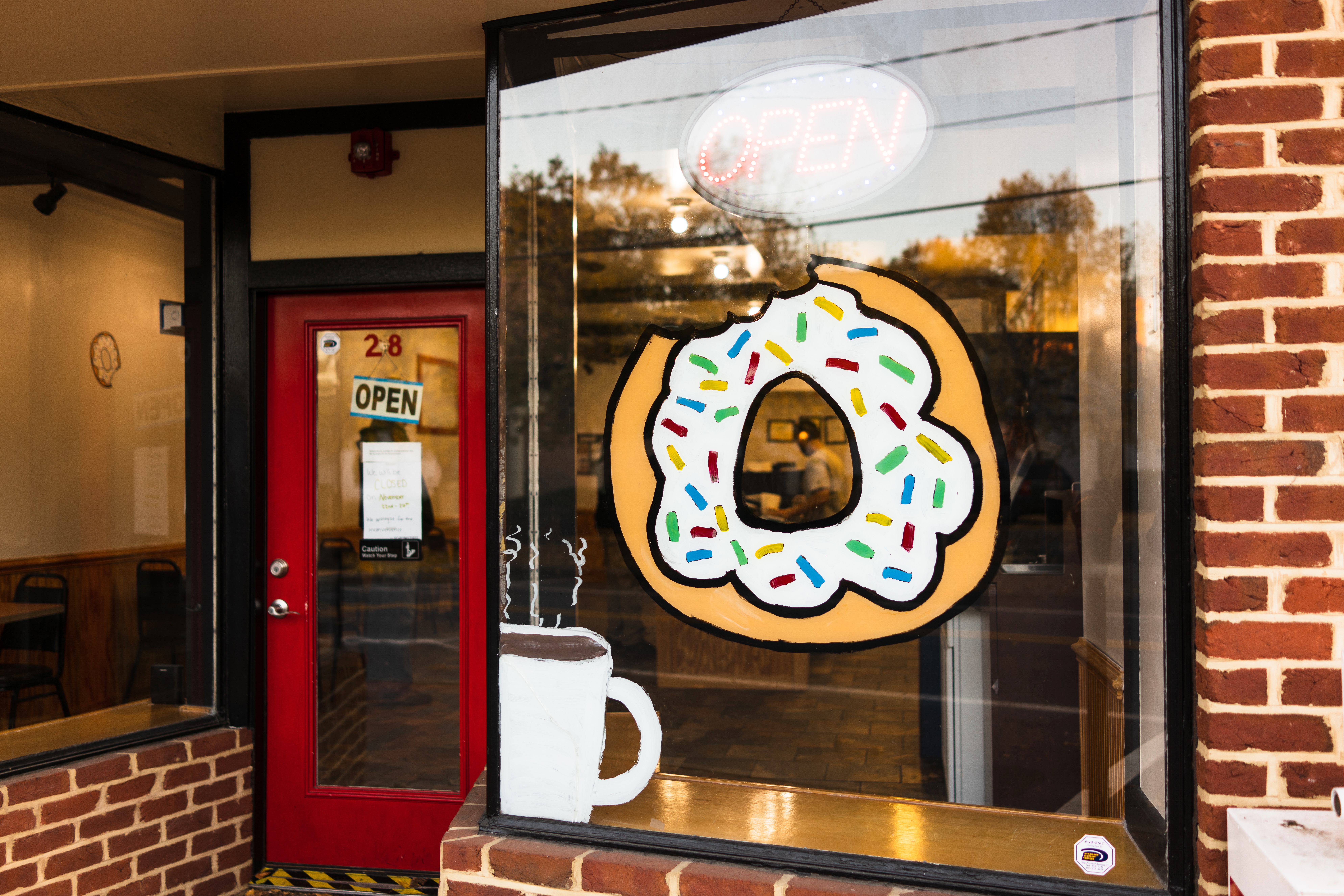 This photograph captures a cozy donut shop's entrance, featuring a playful, painted donut in the window alongside a steaming cup of coffee. The warm glow from the 'OPEN' sign invites passersby, creating a welcoming atmosphere. Soft, natural light filters through, enhancing the inviting mood and drawing attention to the delightful artwork that beckons customers inside.