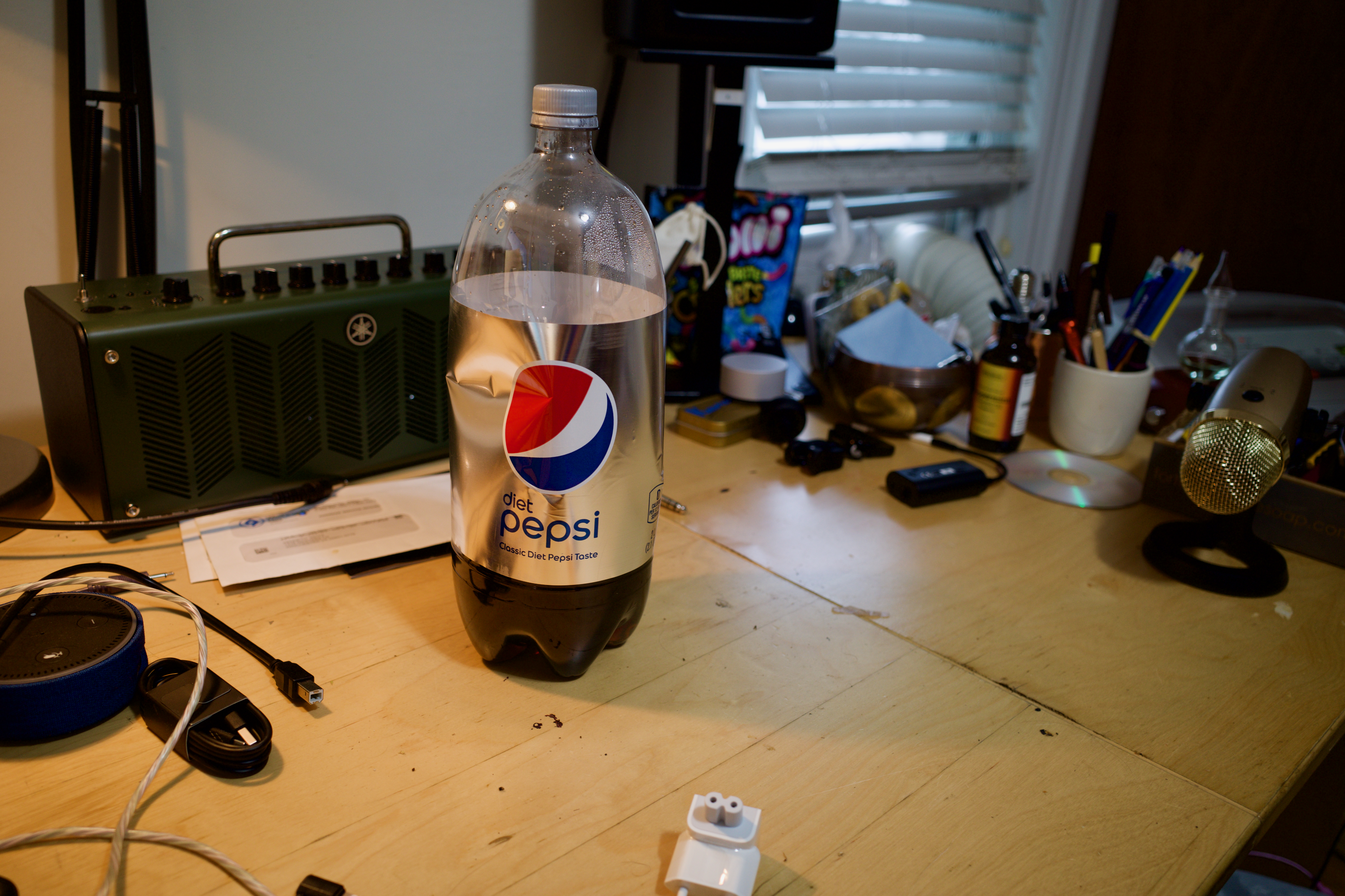 The photograph captures a casual, cluttered desk scene, dominated by a half-full bottle of Diet Pepsi, which stands out against the backdrop of assorted office supplies and electronic devices. The soft, natural lighting coming from the window adds warmth to the space, evoking a sense of everyday life and familiarity. The composition draws the eye to the soda bottle, suggesting a moment of refreshment amidst a busy, creative environment.