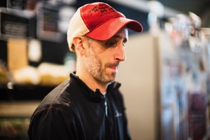The photograph captures a man in profile, deeply engaged in his work. Soft, ambient lighting highlights the contours of his face and the subtle textures of his clothing, creating an intimate atmosphere. The blurred background suggests a bustling environment, contrasting the calm focus of the subject as he concentrates on his task.