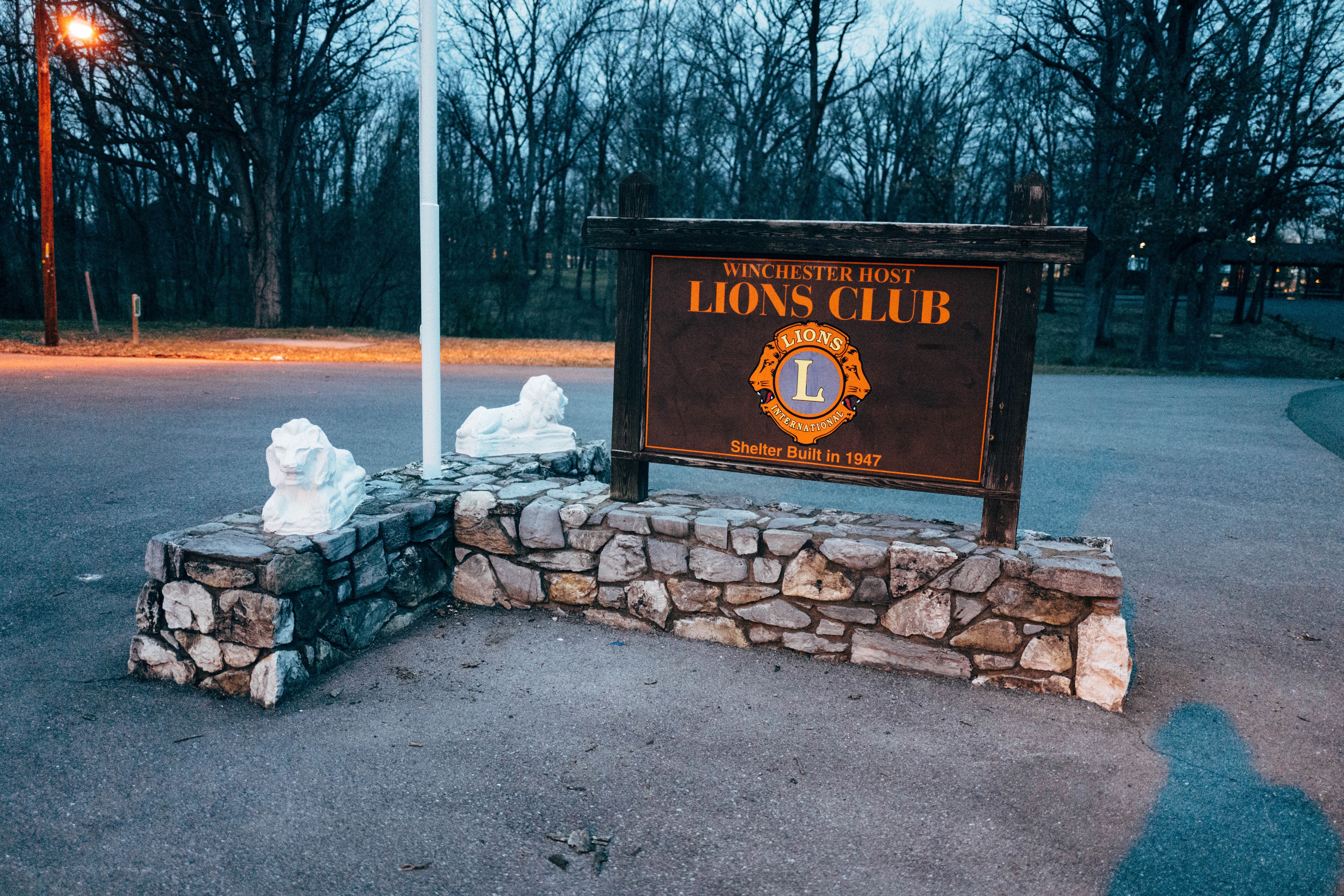 The photograph captures the entrance sign of the Winchester Host Lions Club, framed by stone pillars and flanked by two white lion sculptures. The cool blue tones of the twilight sky create a tranquil yet somber mood, while a faint warm light from a nearby lamp subtly illuminates the scene, inviting visitors into the quiet, wooded surroundings. The composition focuses on the sign as the central subject, grounding it in a landscape that hints at community and camaraderie against the encroaching evening.