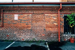 This photograph captures a weathered brick wall, characterized by its bold red hues and a series of textured patterns. A single pot of greenery peeks through a barred window, contrasting the industrial elements like the vivid red piping and a no-parking sign. The mood is a blend of urban decay and subtle vitality, illuminated by soft, natural light that enhances the wall's gritty details.