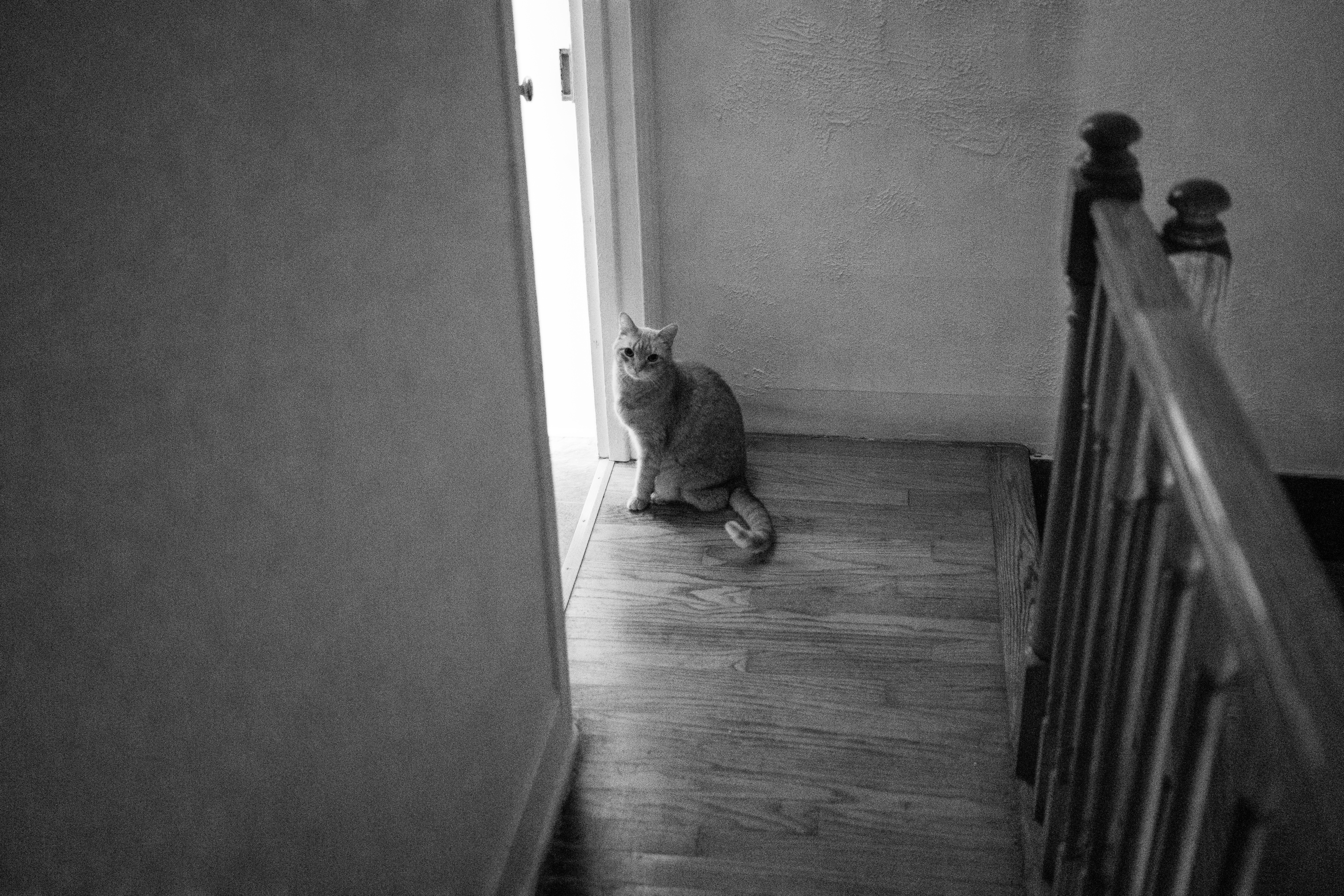 A solitary cat sits at the edge of a dimly lit hallway, gazing intently towards an open door bathed in soft light. The composition highlights the animal's cautious demeanor, contrasting the dark wooden stairs with the warm glow from the threshold. This interplay of shadows and light creates an atmosphere of quiet contemplation and intrigue.